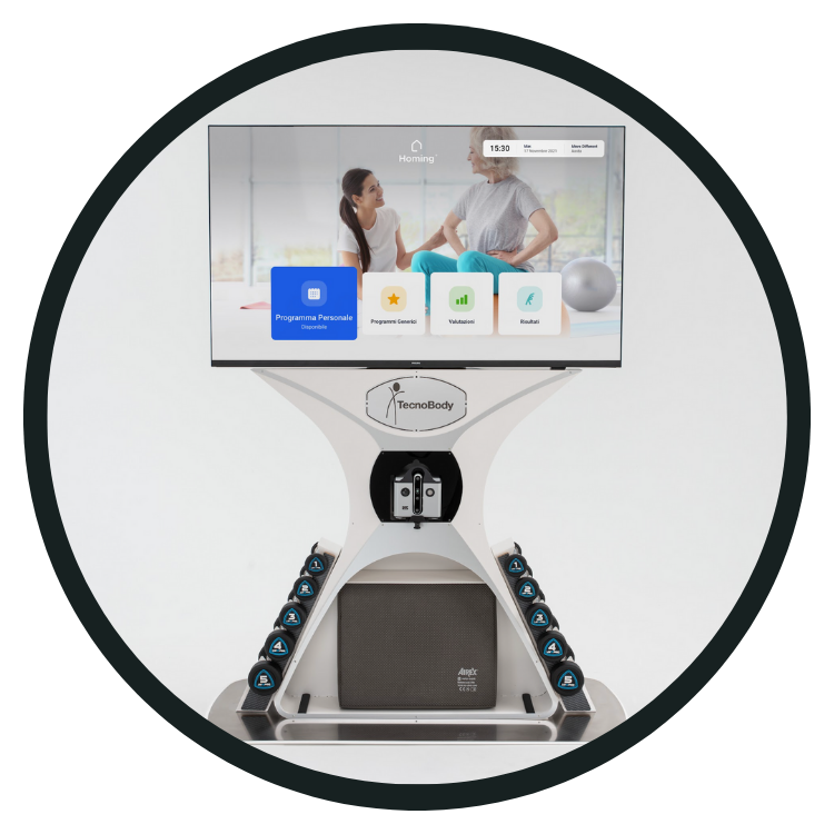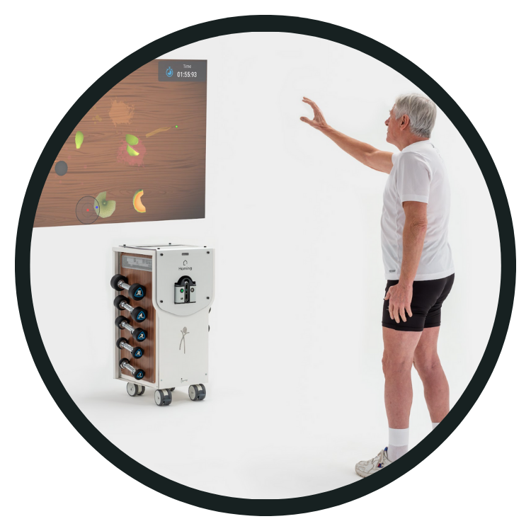 A Homing TT orvostechnikai eszköz ambuláns és otthoni használatra, motoros és poszturális aktivitási programokhoz és gyakorlatokhoz. HD kamerával ismeri fel a páciens mozgásait, és kvantitatív (ismétlésszám) valamint kvalitatív (testtartás/egyensúly) metrikákkal elemzi azokat.