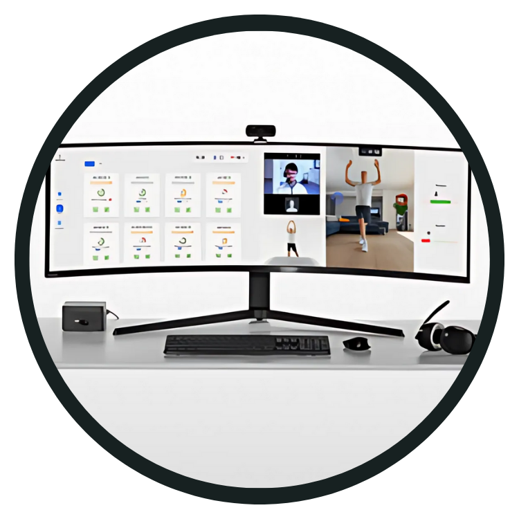 A Homing Control Station klinikai távrehabilitációs vezérlőállomás valós idejű páciensmonitorozással. A 49 hüvelykes ívelt kijelző (32:9 képarány) és a 21,5 hüvelykes érintőképernyő (1600 × 900 pixel) átfogó áttekintést biztosít.